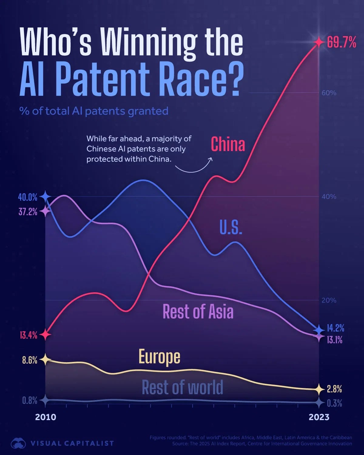 No âmbito das patentes, a China domina absolutamente, com 70% de todas as patentes de IA globais. Isso representa um crescimento de +56 pontos percentuais em apenas 13 anos. A maioria delas é apenas registrada localmente e tem baixa taxa de concessão, o que faz com que esses números não possuam necessariamente um impacto significativo no âmbito global. Mas, por outro lado, esse crescimento também sinaliza a força do desenvolvimento de ecossistemas locais, em um país cujos últimos planos quinquenais apontam para o caminho da autossuficiência tecnológica.