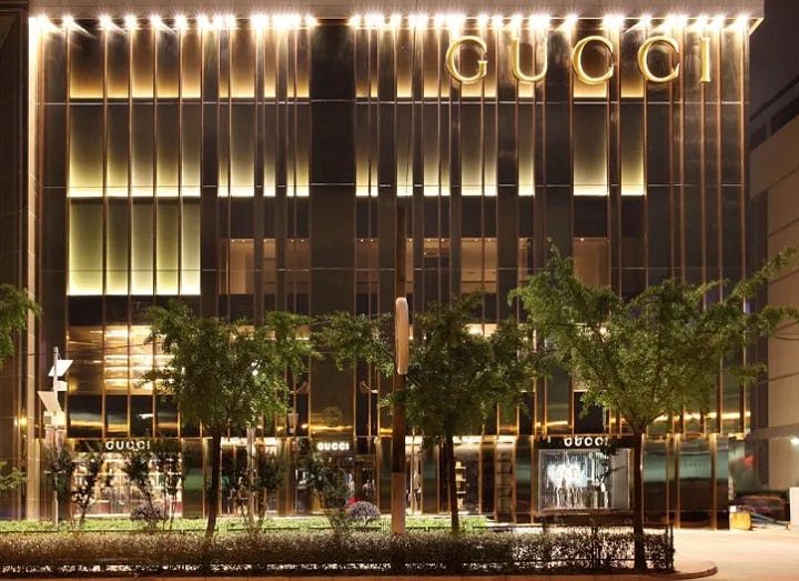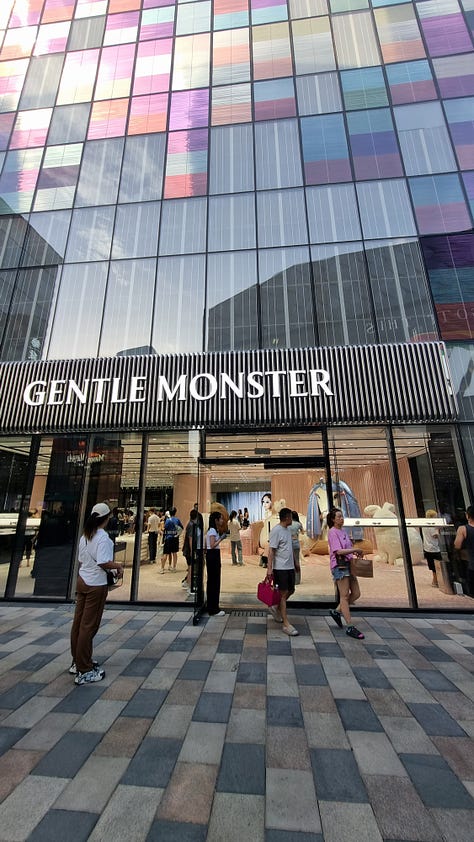 (só pra encantar os olhos, imagens de lojas em Shanghai, destinos de muitas flagships de marcas globais. Nessa ordem: Gentle Monster, Anta Sports, Pop Mart, Li Ning, Shui On - food market, Gucci flagship e Supreme flagship)